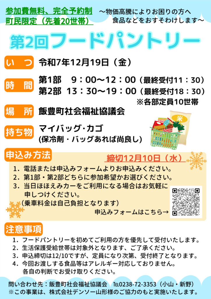 2025.11.06お知らせ 【第2回フードパントリーのお知らせ】 昨今の物価高騰等の影響により生活にお困りの方を支援するための取り組みとして無償で食料品等をおすそわけする「フードパントリー」を12月19日(金)に実施することになりました。対象は、町内の方限定で先着20世帯(完全予約制)となります。 詳しくは下記のチラシをご覧くださり、注意事項をご理解いただいたうえで、お申込みくださいますようお願いいたします。 ※フードパントリーは、まだ食べられる食品を企業などから集め、保管・管理するフードバンクに提供された食品等を支援が必要な方が直接提供を受けるものです。