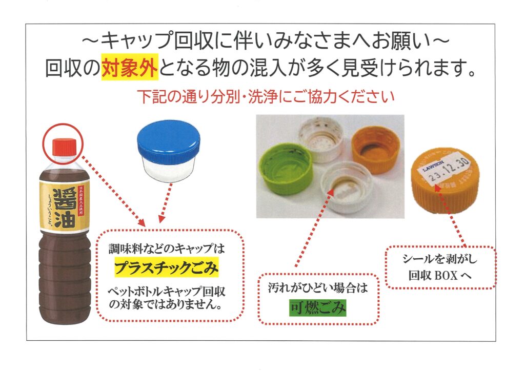 2025.12.10お知らせボランティア エコキャップについて(お願い) エコキャップ回収を始めて半年が経過し、たくさんの方からご協力をいただいております。 ここで、皆様にお願いしたい事項が3点ほどございます。 1.キャップの分別をしっかりと(プラスチックの混入が多く見受けられます) 2.キャップは水洗いし乾燥まで(水洗いしても落ちないものは可燃ごみへ) 3.一度に大量の持ち込みはお手数ですが、お問い合わせの上持ち込みをお願いします。 (3つ目に関しては、45ℓのゴミ袋2つ以上となる場合) みなさんのご理解・ご協力のほどよろしくお願いいたします。